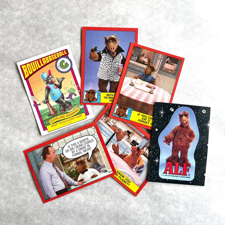 ■ Great pictures of ALF & co, funny captions and cat jokes a plenty. series 1 features "ALF - his life and times" segments on the reverse, for example: " MELMAC FACT - To run for president on Melmac, your middle name has to be the name of a cheese" 2nd series features "ALF - the Shumway family tree" segments on the reverse. each pack also contains a Bouillabaseball Card and 1 sticker. fun times with ALF.